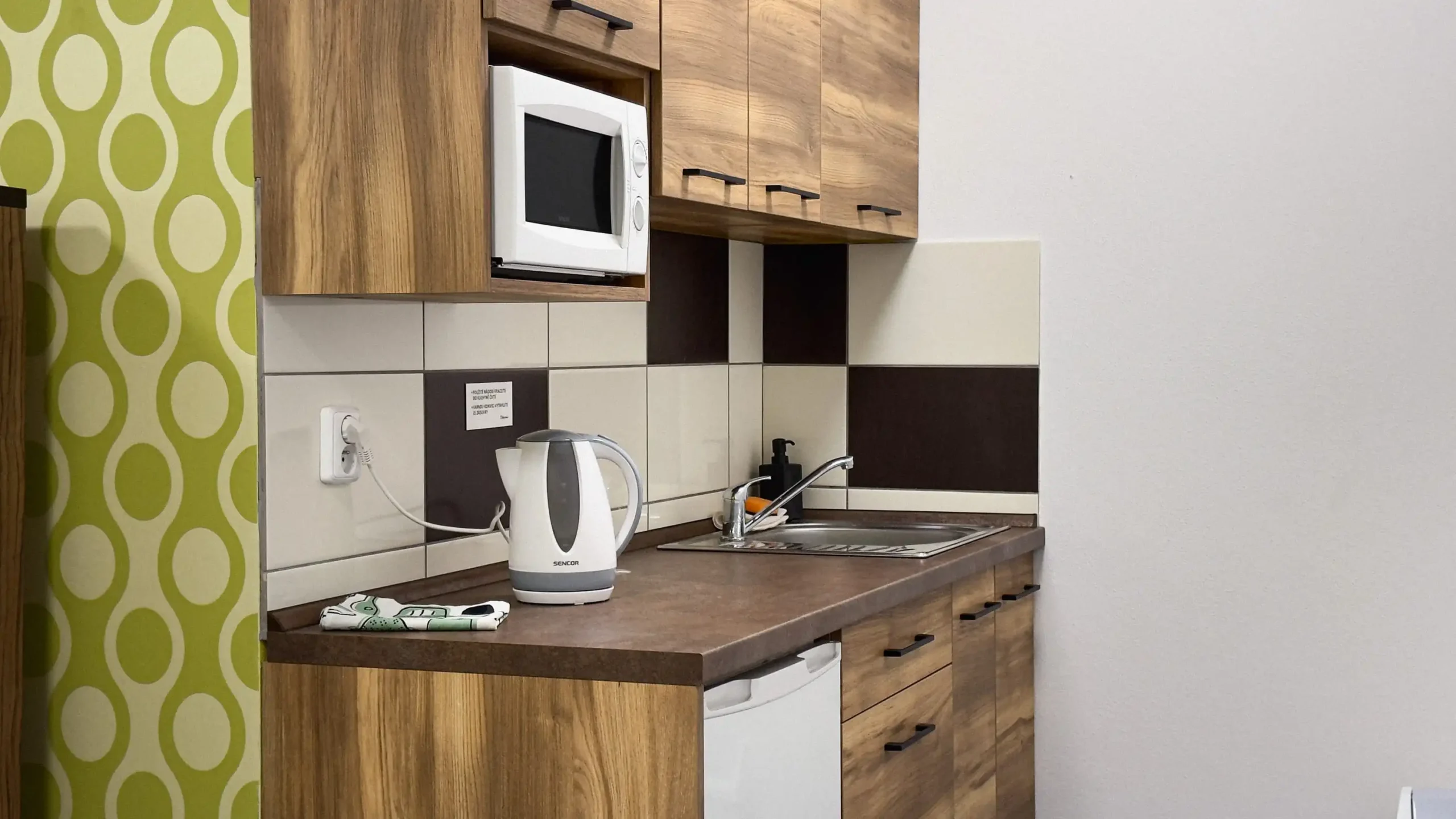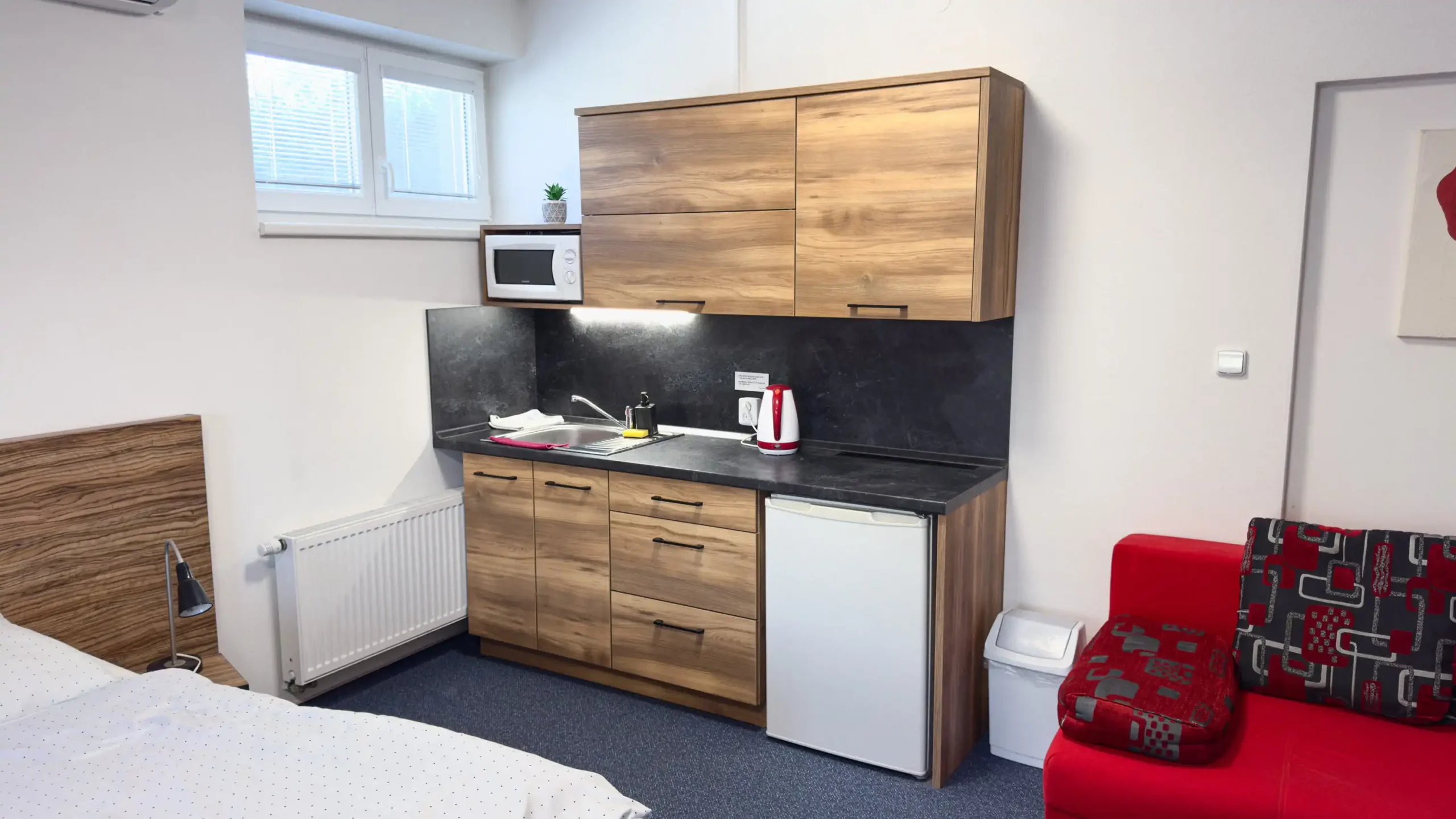 Dvoulůžkový apartmán se nachází v přízemí penzionu s možností přistýlky pro 2 osoby (rozkládací pohovka). Pokoj je vybaven kuchyňkou s lednicí, televizí a sociálním zařízením.