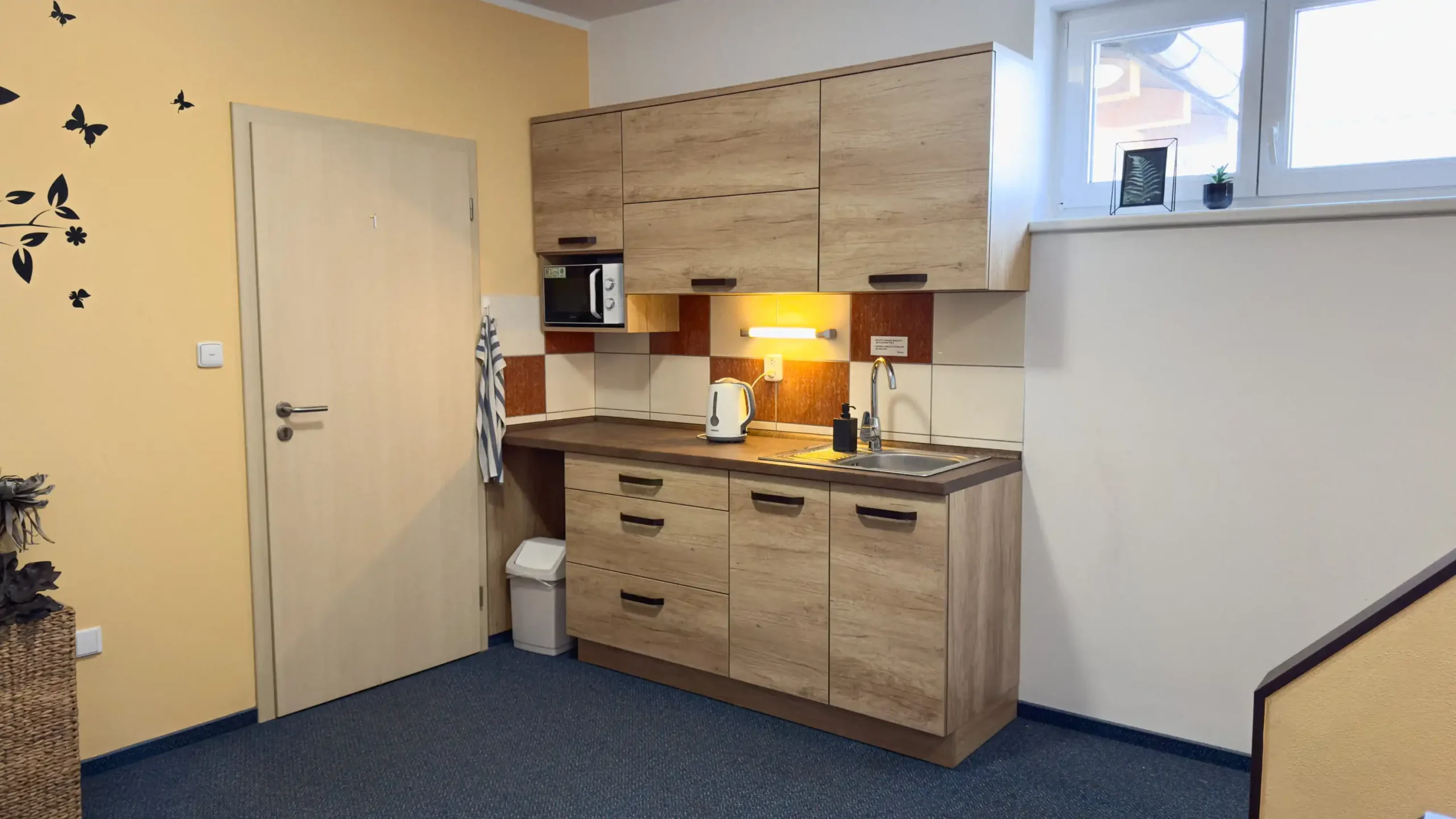 Všechny pokoje mají vlastní sociální zařízení se sprchovým koutem, WC a umyvadlem. Na chodbičce každého pokoje je velká vestavěná skříň se zabudovanou lednicí a odkládacím panelem.